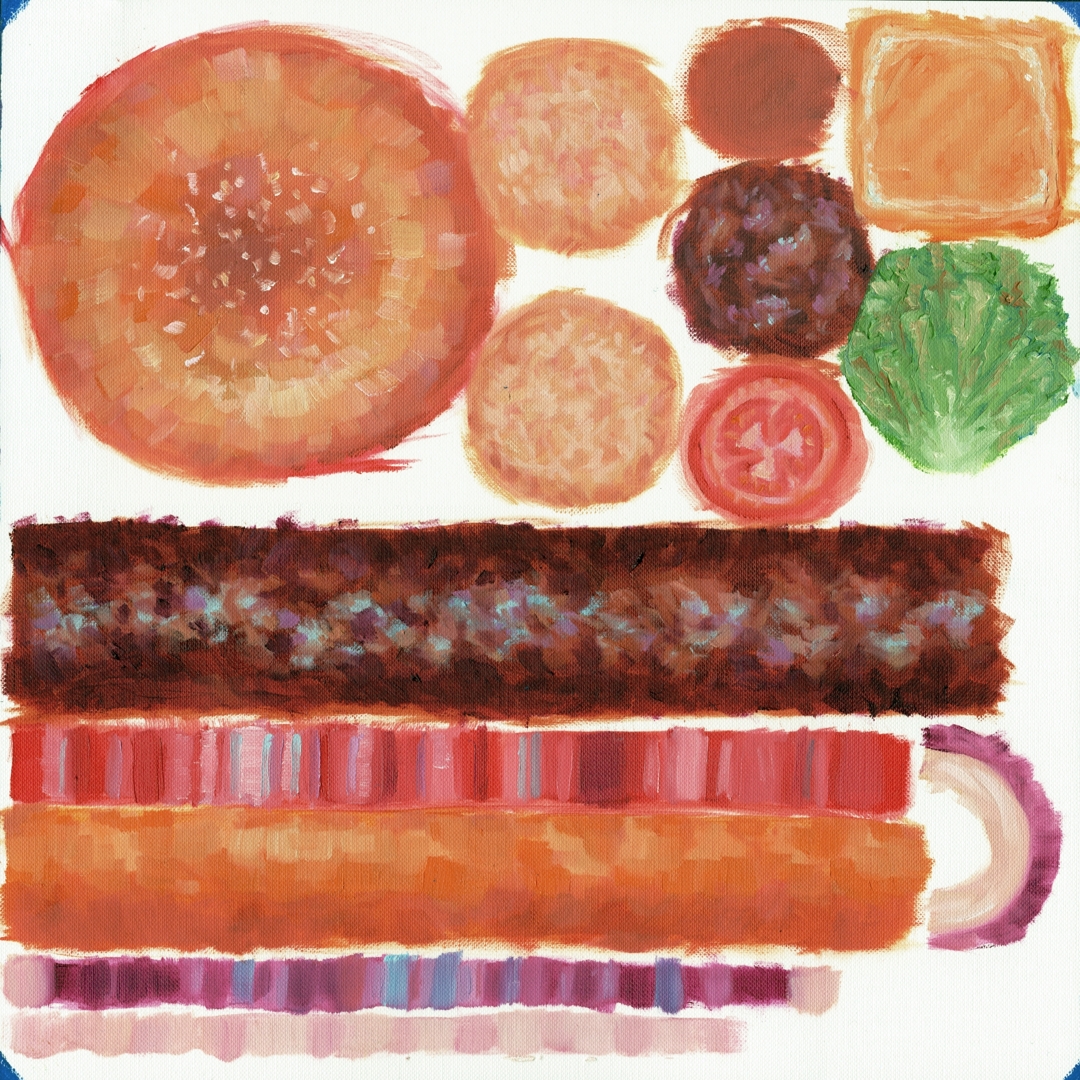 For this piece I chose to paint a burger because I wanted to try out painting a bunch of different surface types, and burgers are constructed from many pieces that have different properties. For example, the onion and tomato are shiny at the side whereas the buns are mostly matte.